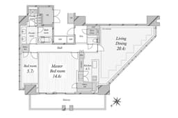 Rising on the 25th floor of PROUD TOWER SHIBUYA, this brand-new, never-occupied corner residence captures sweeping southwest and northwest views through high sash windows that flood the living spaces with light. From the tiled entryway to the expansive living and dining area, refined materials meet modern comfort, enhanced by underfloor heating, double flooring and ceilings, and advanced ventilation. A generous 2LDK layout is complemented by a walk-in closet, shoe-in closet, and two private trunk rooms, offering rare storage flexibility in central Tokyo. Located moments from Shibuya, the neighborhood blends global energy with residential sophistication. Trend-setting dining, cultural venues, and green pockets coexist seamlessly, making it ideal for professionals, couples, and small families seeking an elevated urban lifestyle.